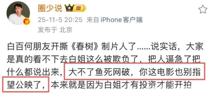 白百何的好友们也纷纷站出来为她发声。一位名为 “圈少说” 的百万粉丝大 V 放出疑似白百何好友朋友圈截图,指责《春树》制片人彭瑾追着白百何 “吸血” ,把她当垫脚石,还爆料《春树》是因为白百何才有投资能开拍 。这位大 V 更是火力全开,放话 “大不了鱼死网破,你这电影也别指望公映了” ,言辞激烈,将事件推向了更高潮。
